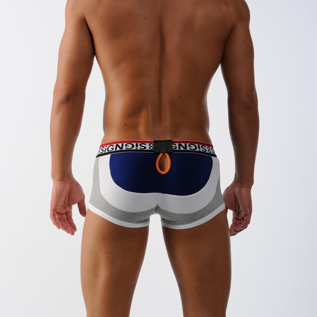 ライトグレイベースにネイビーとホワイト、オレンジがアクセントカラーの爽やかメンズなイメージ。