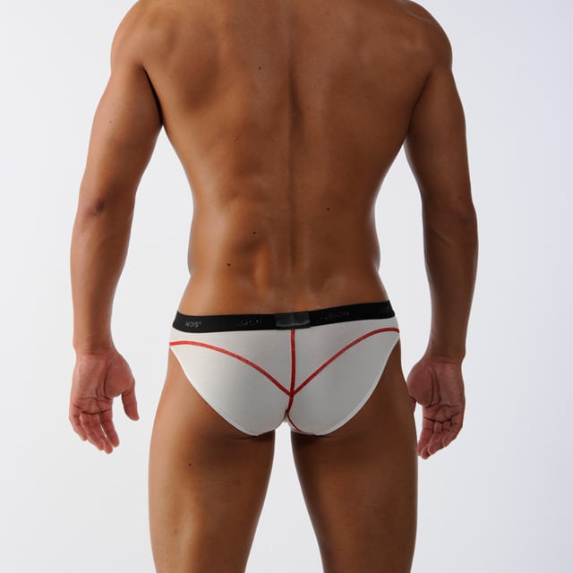 それぞれの生地カラーに配色のステッチをオシャレに効かせたビキニは、 一見競泳パンツのような切り替えステッチがデザインポイント。