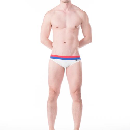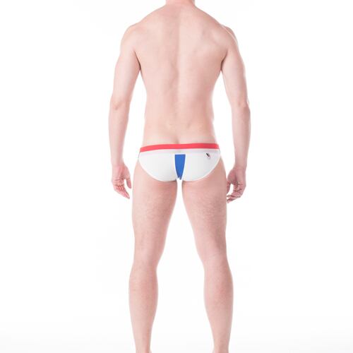 ウエスト上部は前後ともレッド生地を使用し、その下のフロントパーツを横に、バックの中央パーツを縦にそれぞれブルー生地で切り替えた3カラーのPOP&SPORTYなスイムウェア。