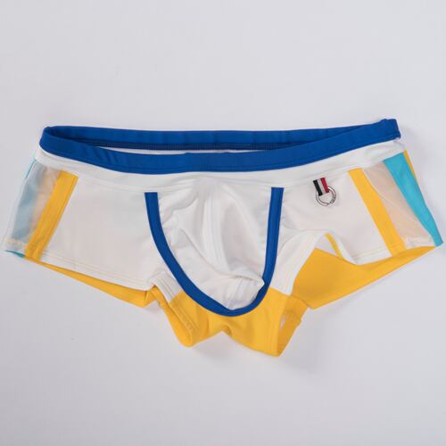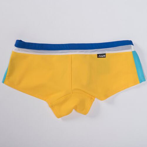ヒップの上部切り替えパーツの2段目部分と両サイドを白いメッシュ生地で切り替えたチョットSEXYイメージなボクサータイプのスイムウェア。