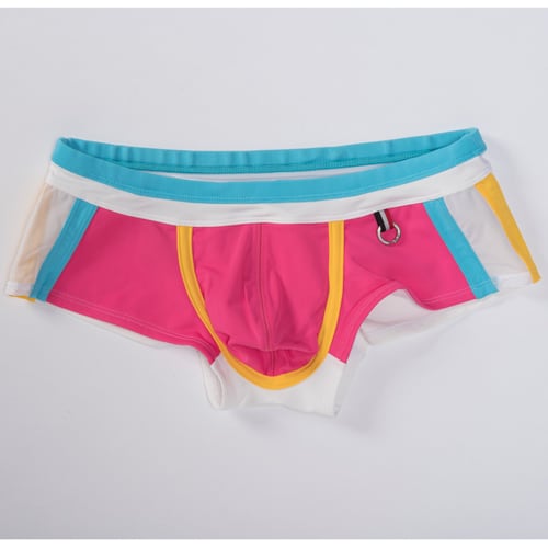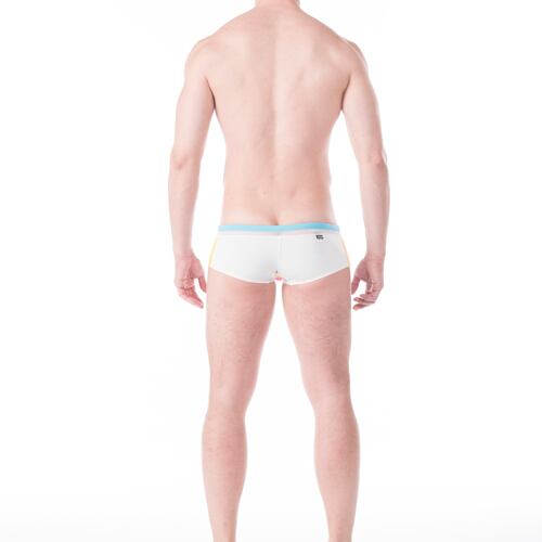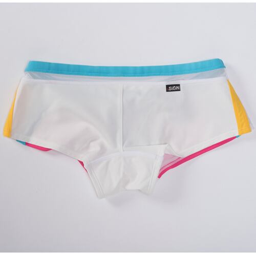 ヒップの上部切り替えパーツの2段目部分と両サイドを白いメッシュ生地で切り替えたチョットSEXYイメージなボクサータイプのスイムウェア。