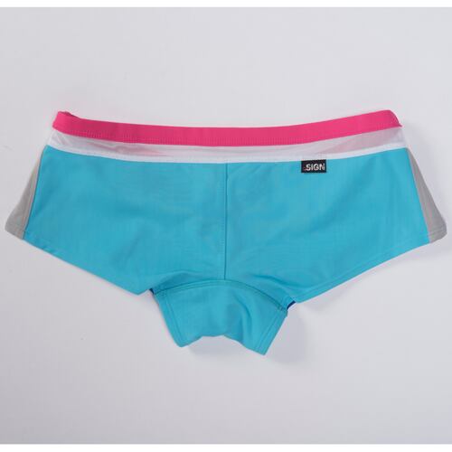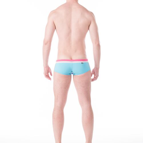 ヒップの上部切り替えパーツの2段目部分と両サイドを白いメッシュ生地で切り替えたチョットSEXYイメージなボクサータイプのスイムウェア。