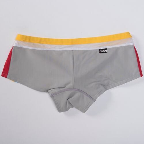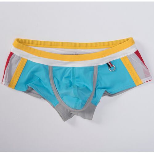 ヒップの上部切り替えパーツの2段目部分と両サイドを白いメッシュ生地で切り替えたチョットSEXYイメージなボクサータイプのスイムウェア。